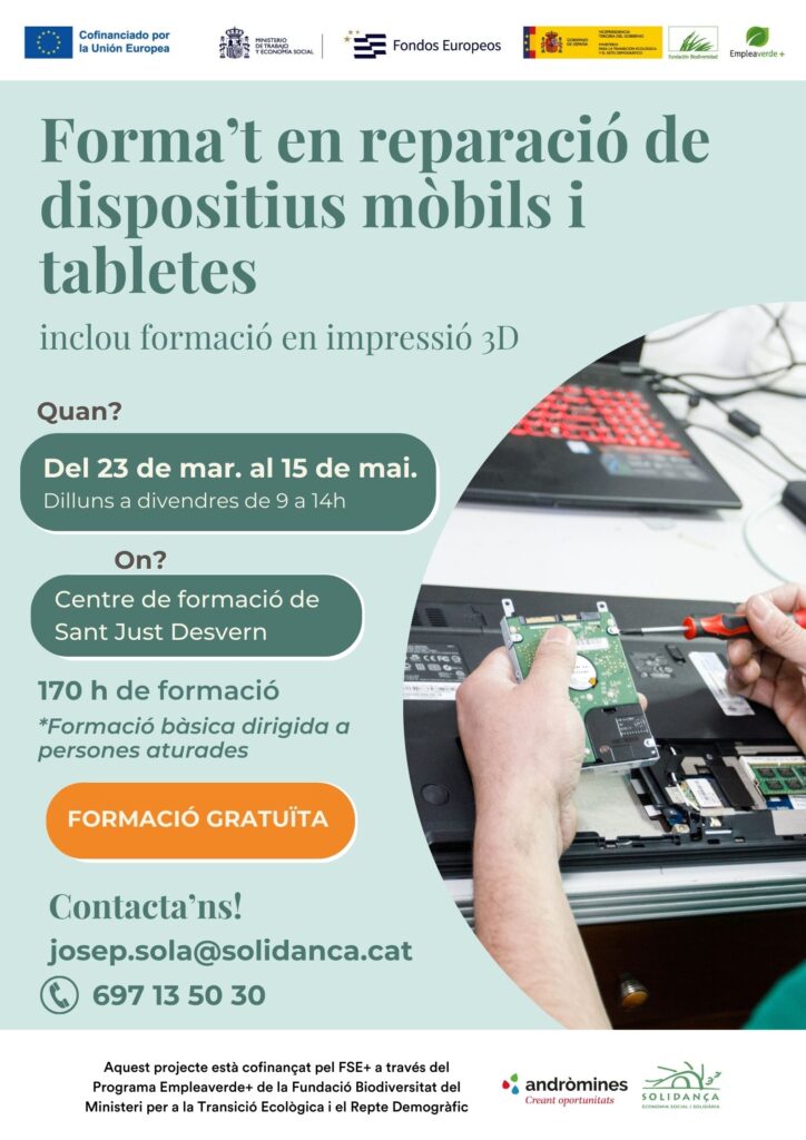 Davant el creixement constant de la demanda de professionals amb coneixements en reparació de petits dispositius electrònics, posem en marxa una nova edició del curs ReparaTIC de Reparació de Mòbils i Tauletes, que enguany incorpora com a novetat una formació en impressió 3D.