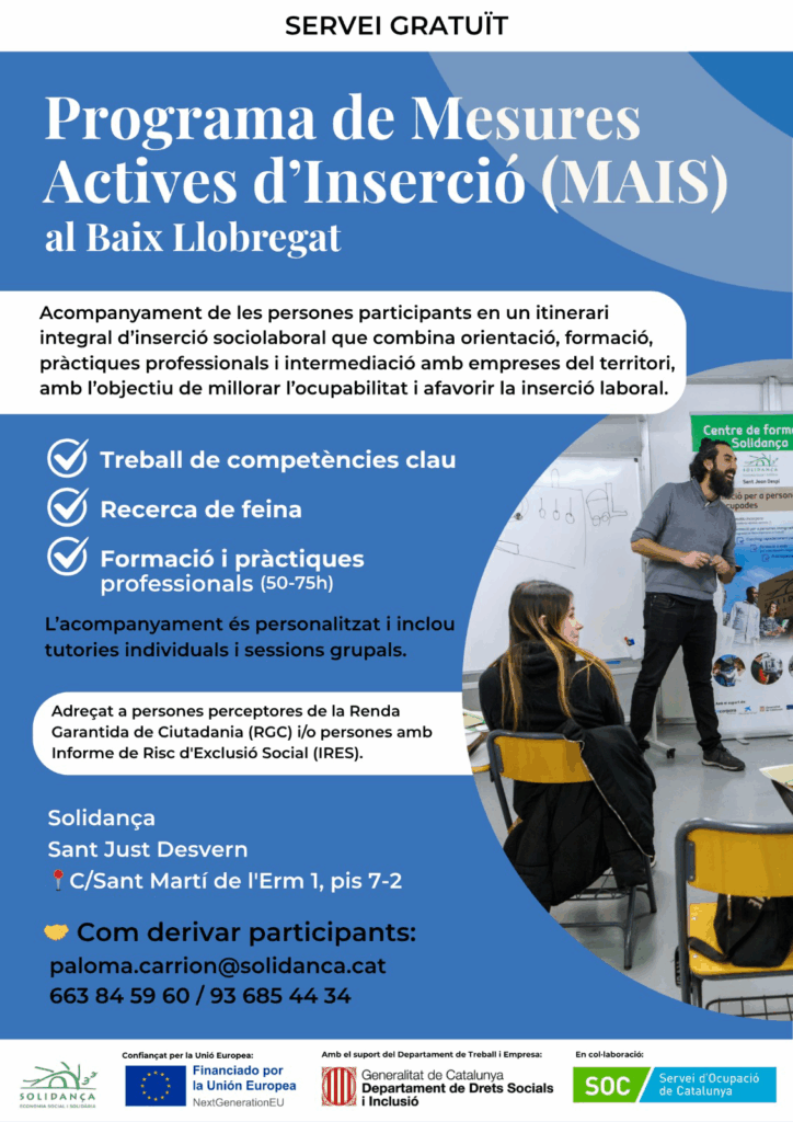 El Programa MAIS tindrà una durada de 8 mesos i oferirà 30 places per a persones del territori. Les sessions i activitats es desenvoluparan al Centre de Formació de Solidança a Sant Just Desvern, combinant orientació, formació, pràctiques professionals i acompanyament personalitzat per ajudar cada participant a trobar el seu camí cap a l’ocupació.